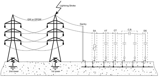 - It may be connected through the connection of the guard protection wire (GW) or OPGW (optical ground wire) to the gantry grounding system [48,49]. References [48,49] illustrate the different ways of grounding the guard protection wire/OPGW with the substation earthing mat.