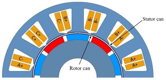 Fractional slot tooth concentrated windings (FSCW) have stimulated research interest [10,11]. This winding configuration shows shorter end winding, the higher fault tolerance rate, the lower manufacturing cost, the harder mechanical characteristics, and higher efficiency. Meanwhile, the windings have no overlap between each other, so the interphase insulation is well. However, in terms of the magneto motive force (MMF) contents, the air gap magnetic field of the permanent magnet synchronous motor is not sinusoidal, resulting in certain harmonics. Apart from the working harmonic that generates electromagnetic torque, the odd harmonics cause a lot of problems as vibration, noise and heat [12,13,14]. A canned permanent magnet synchronous motor with FSCW is studied, with emphasis placed on can loss and the air gap flux field.