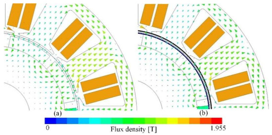 A flux path with and without cans is shown in Figure 2. The ideal 3-phase sinusoidal AC excitation with a rated load was applied. Through the stator teeth, yoke, air gap, PMs and rotor yoke, the main flux loop was formed and was similar in both motors. Due to the use of cans in the air gap that led to the eddy current induction and thus the magnetic energy consumption in the stator and rotor parts, the flux density was slightly reduced.