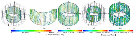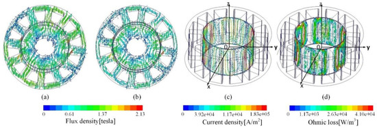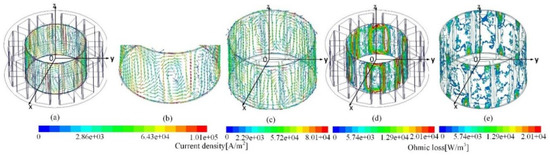 As to the rotor can, Figure 3c–e respectively shows the eddy current and loss distribution. Similar eddy induction occurred, however the density was comparatively much lower. This is due to the synchronous rotation of the rotor can that disables the cut by the air gap flux field. However, swirls still exist, due to the cogging effect that made a slight relative motion between the air gap field and the rotating can. Consequently, the loss was considerably lower, even if the end effect looked moderate.