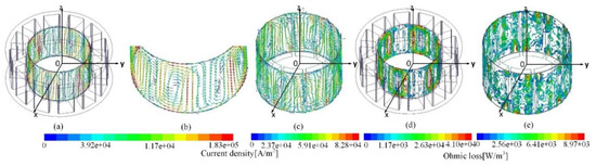 Figure 4 shows the eddy current and loss distribution on cans when alternatively the axis current was injected. As to the stator can, Figure 4a,b shows the eddy current. Compared to Figure 3, a similar swirl-like distribution was demonstrated. However, difference points are listed as follows: (1) higher density; (2) deviation of all excited channels that was originally parallel to the Z-axis and (3) an angular shift of 90° in an electrical degree for the excited 10-swirl configuration, based on the Z-axis, compared to Figure 3a. The reasons are as follows. As to (1), the amplitude of the axis current was greater. As to (2), the angular positional shift of the rotation part led to the redirection of the air gap flux, and thus to the shift of the excited swirls. As to (3) the axis current differs by 90° in an electrical angle in the terms of time.