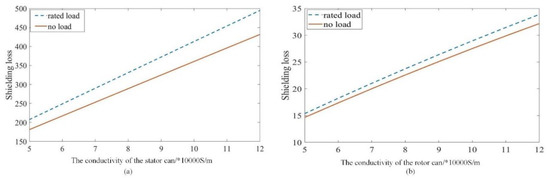 Different materials of shielding can have different conductivity, and conductivity variation affects can loss. Figure 8 shows the shielding loss change with the conductivity variation, which had the following characteristics: (1) in general, the loss increased linearly with conductivity variation, stator can loss was higher than rotor can loss; (2) for the stator can, the shielding loss at the rated load was higher than that at no load, and the difference between them increased with conductivity variation and (3) as to the rotor can, similar loss characteristics and a lower density occurred, due to the synchronous motion. Low conductivity can be more effective to suppress the eddy current. The canned motors inherence had high operating temperature, which caused conductivity of the can to increase, which reduced the eddy current suppression ability and thus exacerbated the temperature rise of the motor. As to the shielding material, a lower conductivity material is desired.