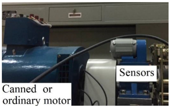 Two permanent magnet synchronous motors that shown in Figure 9 were the objects of this test, one of which was a conventional motor and the other was a shielded motor. In a test bench, a pair of permanent magnet motors with the same geometry was used, but one of them was the shielding motor. The loss of the standard motor included copper loss, iron loss, fiction loss and stray loss, which was applied to obtain iron loss and stray loss. For both motors, the iron loss and stray loss could be seen as the same. The procedure of the test followed these steps. First, using the energy conversion principle to calculate the total loss of the shielding motor. Second, using the sliding test to separate the friction loss. Then, calculating the copper loss by . Following the above steps, the iron loss and stray loss of the conventional motor were obtained. Finally, the can loss was separated by subtracting the copper loss, iron loss, fiction loss and stray loss from the total loss of the canned motor. Table 3 shows the loss and efficiency that were measured at the rated load and steady state by the test and Table 4 illustrates the loss and efficiency that were measured at no load and the steady state by the test.