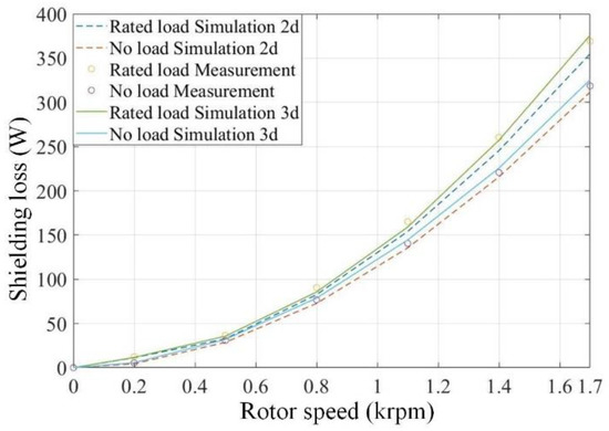 The comparison of FE and the measurement due to the use of cans is demonstrated in Figure 10. The tested motor operated in no and rated load, the shielding loss measured by the test was basically the same as that by the FE, the difference between the two ways increased with increasing speed. At no load, the value of the measurement was relatively low, this is due to the overheating that increased the local resistivity of the can at the end, which helped to suppress induced eddy current, but it was not included in 3d. At the rated load, the value of the measurement was higher at lower speeds due to the additional losses caused by the electrical supply harmonics. However, as the speed increased, due to the local resistivity effects, the measured value even fell below 3d. Due to the end effect, the shielding loss measured by 3d was higher than that measured by 2d and the numerical gap was enlarged with the rotor speed.