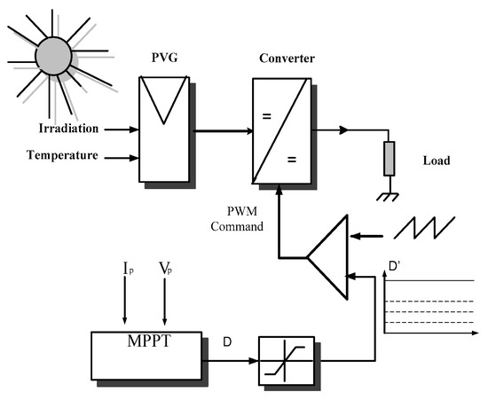 In [3], the authors emphasized that that a high temperature reduces PV panel efficiency and that thermal and wind conditions have a significant influence on the PV panel operating temperature; therefore, the PV characteristics may be easily affected by a change of in weather conditions. In this work, we propose the use of an MPPT controller combining an MPPT algorithm and a DC converter. The MPPT controller can optimize the operation of the PV panel under any weather conditions; the design of the controller is very important because its performance reflects the amount of power that can harvested. A wide variety of algorithms have been employed to track PV panel MPP; for example, Inc Cond, hill climbing, perturb and observe (P&O) and the reference voltage [4,5,6,7].These algorithms are widely used because of the ease of their implementation; however, they have their own drawbacks, which include uncertainty due to sensitivity to abrupt variations in the weather conditions [8,9,10,11,12,13,14] and oscillations around the operating point [14,15]. These controllers provoke disturbances by acting on the DC converter command and then observing its impact on the PVG power feedback output. These may, however, miss the target because of an incorrect choice of step size value, which is usually chosen by the method of testing and trial [8].