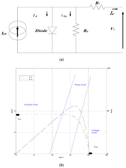 PV cell-equivalent circuit and PV characteristics. (a) PV cell-equivalent circuit; (b) P-V and I-V characteristics, (1000 W/m2), (25 °C).