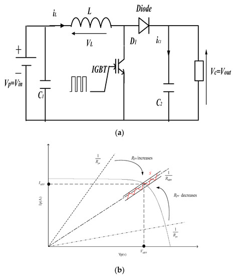 Boost converter Circuit and I-V characteristics. (a) Boost converter circuit; (b) I-V characteristics.