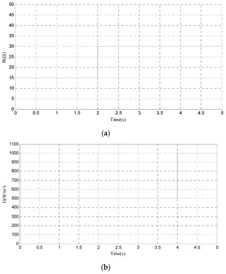 To prove the increased performance of the proposed algorithm, a sudden and instantaneous external and internal deviation is applied to the system. Irradiation variation is considered to be an external disturbance, and load variation is considered to be an internal disturbance. Figure 6a,b shows the load curve, R, and the irradiation curve, G, respectively. When the time is equal to 2 s, the load is increased from 15 Ω to 30 Ω; when the time is equal to 4 s, the irradiation is increased from 500 W/m2 to 1000 W/m2.