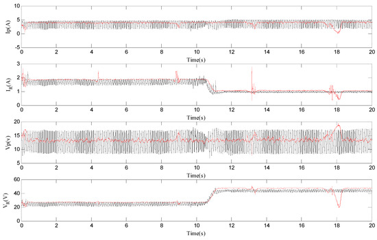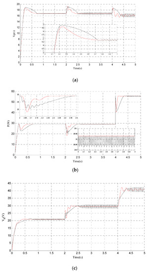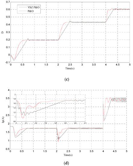 To start real-time tracking, the SIMULINK MPPT control block was downloaded again to generate the new C for the dSPACE board. It should be noted that this procedure requires some time; therefore, some differences between the obtained results could appear. In the next figures, the black curve shows the conventional P&O results, and the red curve shows the result obtained using the VSZ.
