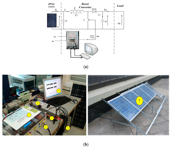 The implementation of the MPPT was carried out with a dSPACE DS1104 real-time control layout card. The sensors were mounted in the boost converter to help to acquire measurements. Figure 8a shows the diagram of the hardware setup, and Figure 8b shows the used hardware.