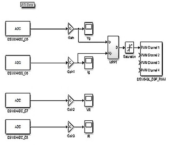 For the real-time experiment, a dSPACE controller board was chosen as the control platform. The output–input (O/I) interface of the dSPACE DS1104 help to enable the linkage between the MATLAB/SIMULINK and the real hardware system. [31,32,33]. The output–input (O/I) blocks are analog-to-digital converters (ADCs) and digital-to-analog converters (DACs). Using the MATLAB/SIMULINK real-time workshop (RTW) Toolbox, the SIMULINK model was converted to C-code; later, the codes were treated by a compiler and connected to the real-time dSPACE processor board. The PWM signal was 20 kHz, which was directly produced to control the switching MOSFET of the boost converter.