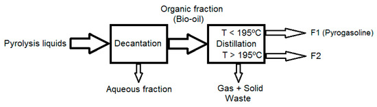 The pyrolysis liquids were first decanted to isolate the aqueous fraction from the organic, followed by distillation to separate volatile and non-volatile bio-oil components (Figure 1). Distillation led to two liquid fractions: a more volatile fraction (F1) collected between room temperature and 195 °C and a less volatile one (F2) recovered between 195 °C and the final distillation temperature (around 250 °C).