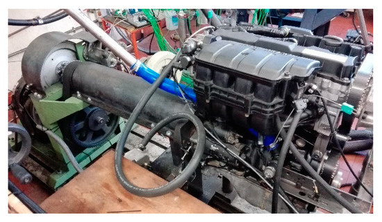 The tests were carried out on a 1.6 L, L4, 4-stroke gasoline engine (Figure 2) that maintained most of the original characteristics, except the intake manifold and valve seats (which were slightly increased in diameter). It was optionally tested without a catalytic converter. The technical specifications of the engine are summarized in Table 2.
