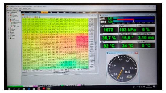 With the aid of an oxygen sensor (lambda probe—λ) adjustments were performed to the injection map until a stoichiometric air/fuel ratio (λ = 1) was reached for each fuel at all points on the map. Adjustments were also made to the ignition map (Figure 3), with the ignition being advanced until reaching the maximum effective torque point MBT (maximum braque torque) without knock.