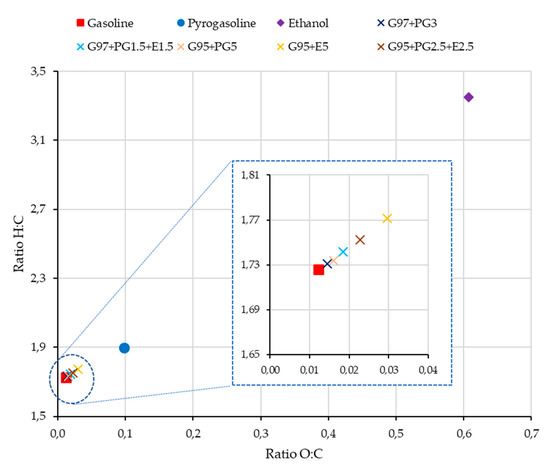 Binary and ternary mixtures of gasoline with pyrogasoline and ethanol in small percentages have practically the same O:C and H:C ratios as gasoline (Figure 4).