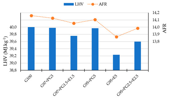 Figure 5 presents the calculation of LHV and the air–fuel (AFR) for the fuels used in the tests.