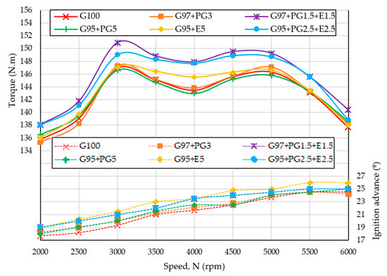 One torque curve that is frankly the best: G97 + PG1.5 + E1.5. The other ternary mixture (G95 + PG2.5 + E2.5) is the second best, showing that the ternary mixtures positively improve the engine’s performance. In the middle position is the binary mixture with ethanol G95 + E5. In the lower positions are the pump gasoline G100, the G97 + PG3, and the G95 + PG5, which are practically coincident. Binary mixtures with pyrogasoline alone did not seem to improve nor worsen the engine’s performance compared to gasoline. The relative positioning of the G95 + E5 and G100 curves is in accordance with the literature [25]. Although the addition of ethanol slightly improved the base gasoline torque, it did not improve it as much as did the addition of pyrogasoline + ethanol.