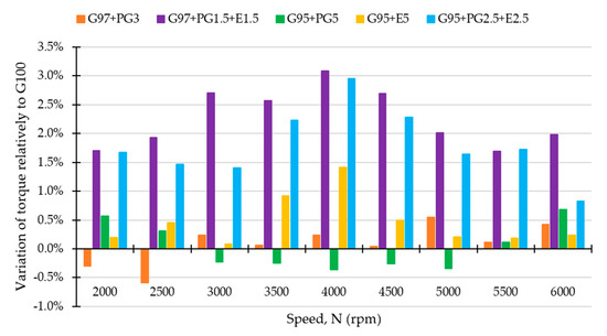 Torque variations (%) of the various fuel mixtures containing 97% and 95% gasoline in relation to the torque of 100% gasoline.