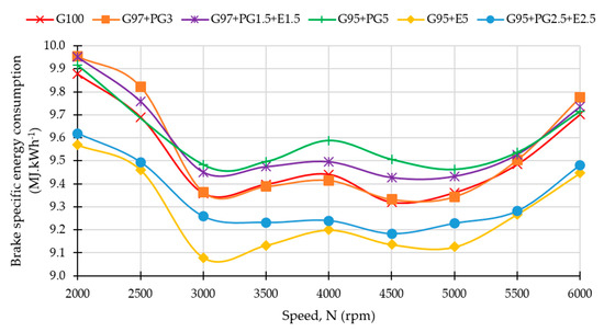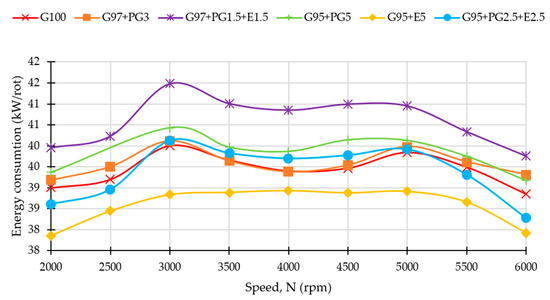 Figure 8 shows the energy consumption for the different fuels along the engine speed range. As expected, the addition of ethanol reduced the energy content of the mixture, due to ethanol’s lower LHV. The addition of pyrogasoline had the opposite effect, with the mixtures using it increasing their energy, as the lower stoichiometric air/fuel ratio of the pyrogasoline (Table 3) in relation to gasoline more than compensated for its lower LHV.