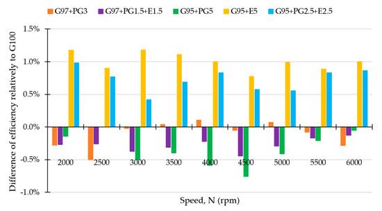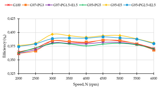 The efficiency curves closely follow the torque curves. As expected, the best average efficiency was achieved by G95 + E5 and the worst by G95 + PG5.