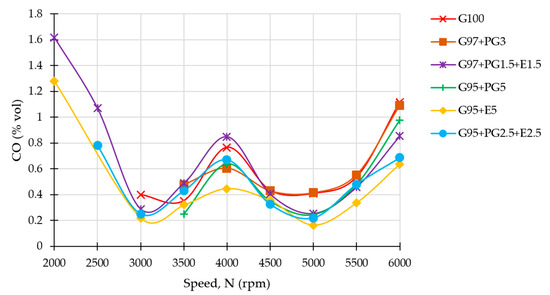 The G95 + E5 and G97 + PG1.5 + E1.5 fuels achieved the lowest and highest CO emissions, respectively. This difference in behaviour may be due to the higher viscosity of pyrogasoline, which worsens fuel atomization and leads to incomplete combustion.