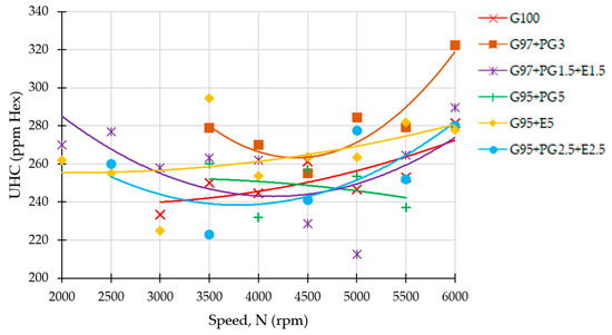 Gasoline displays the lowest UHC curve while binary mixtures with pyrogasoline (G97 + PG3 and G95 + PG5) have the highest UHC curves, so it seems that the addition of pyrogasoline increases the emission of that pollutant.