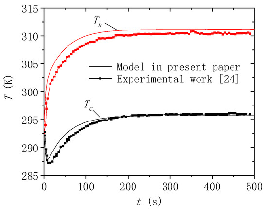 Figure 2 shows the difference in temperature variation between the numerical predictions here and the experimental results reported in a previous study [24]. It can be seen from Figure 2 that the numerical results obtained by the proposed numerical model closely agree with the experimental data. The maximum temperature difference of Th and Tc between the numerical predictions and the measurement data is less than 2 K at t = 75 s and 1.5 K at t = 50 s, respectively. Hence, the validity of the proposed numerical model can be ensured.