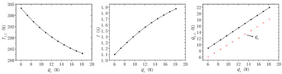 As Qh,G increases, it can be seen from formula (4) that the current I in the system also increases. It can be seen from formula (8) that Ql,C is a quadratic function of current I, and there is an optimal current to get the minimum value of Tl,C. When current I is less than the optimal value, Tl,C decreases with the increase of I [25]. In Figure 3, the maximum value of current I is 1.87 A, which is far from the optimal current value. Therefore, Tl,C decreases with the increase of I, and Tl,C decreases with the increase of Qs.