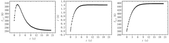 It can be seen that in Figure 4, Tl,C, I, and Th,G all show a nonlinear change trend over time under the condition that the intrinsic heat source Qs is 9.68 W. Among them, the TEC’s cold-end temperature Ql,C has a maximum value of 309.02 K, which is obtained at 1.7 s, 14.54 K higher than the steady-state value of 294.48 K. The current I of the integrated thermoelectric generation–cooling system and the hot-end temperature Qh,G of the TEG showed a trend of gradual increase, reaching a stable state at 8 s and 14 s, respectively.