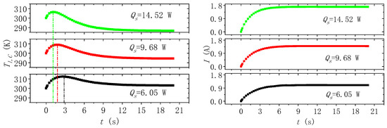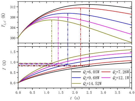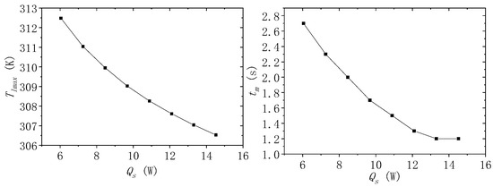 Although the change of Qs does not change the trend of Tl,C and I, it does change the maximum value and corresponding time of Tl,C. As shown in Figure 5, when Qs was 6.05 W, 9.68 W, and 14.52 W, the maximum value of Tl,C was 312.48 K, 309.02 K, and 306.51 K, respectively. In addition, the time corresponding to the maximum of Tl,C was 2.6 s, 1.7 s, and 1.1 s, respectively. In other words, with the increase of Qs, Tl,C can reach its maximum value in a shorter time. In order to further analyze this result, transient results under different Qs conditions were processed. The curve of the maximum value of the Tl,C and its corresponding time change with Qs were obtained as shown in Figure 6.