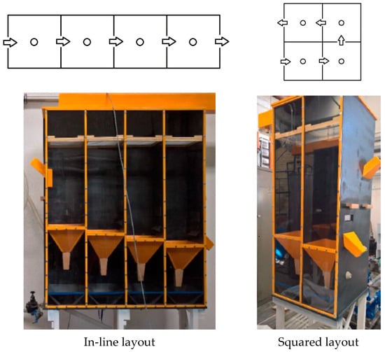 Two different configurations have been constructed, as shown in Figure 2. The modules are horizontally aligned (1 × 4) or placed in a square pitch (2 × 2). All modules are equivalent in terms of hold-up and height gap between units. The first arrangement (1 × 4) presents advantages in terms of simplicity in construction, regularity, and management during operation. However, if used for industrial thermal applications, it may show disadvantages in terms of thermal dissipation and space usage. The second configuration (2 × 2) should overcome these disadvantages but may lead to by-pass phenomena.