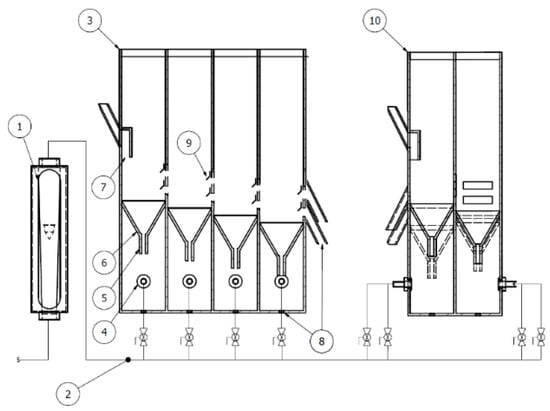 The layouts of the two multi-spouted units: 1—flowmeter; 2—air line and regulation valves; 3—experimental unit 1 × 4; 4—lower air inlet; 5—upper air inlet; 6—pyramid frustum; 7—solid inlet and distributor box; 8—solid outlet; 9—overflow plate; 10—experimental unit 2 × 2.