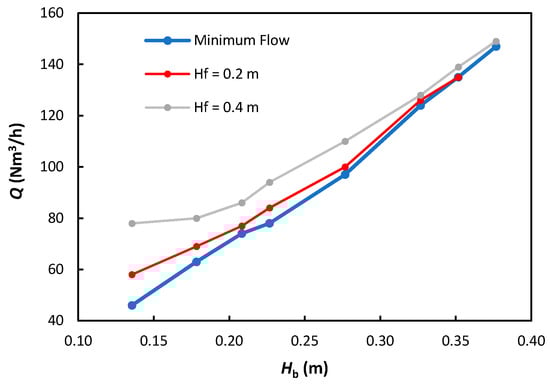 Preliminary tests were performed to assess the correct functioning and operative requirements. As there is no backflow between adjacent modules, these considerations are only presented for a single module operating in batch. The goal was to evaluate the air velocity required for stable spouting as a function of the initial bed depth (Hb). This variable was studied up to a value of 0.42 m, which corresponds to the height of the upper outlet in all modules.