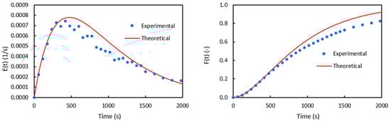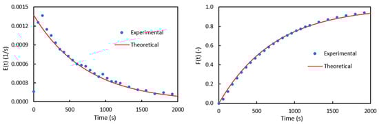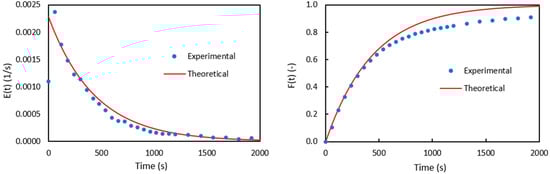 The experimental E(t) points from Equation (7) can be compared with the theoretical E(t) curve for CSTR vessels (Equations (3) and (4)). These theoretical curves are obtained from Equations (3) and (4), calculating τ as the ratio between the unit’s mass hold-up and the mass flow rate. There was thus no fitting of the model to the experimental data: the curves just show the behavior of a CSTR with equal hold-up and feeding conditions.