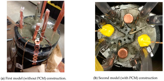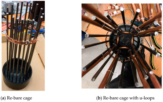 The rebar cage was fastened inside the mold, then a circular ring has surrounded the rebar cage to keep its circular shape. Four U-tube HEX were placed inside the circular rebar cage as in Figure 3a to prevent a thermal short circuit between HEX tubes, the inlet of each U-tube was attached to the inlet of the next leg, and the outlet of each U-tube was attached to the outlet of the next leg. A small space was left between each leg to allow inserting clamps and water-tubes as in Figure 3b. Then PCM containers were inserted into the samples as shown in Figure 1.