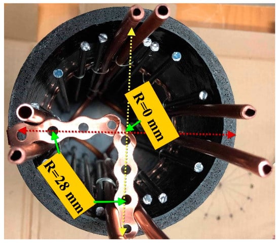 Then thermocouples at different locations were placed inside each sample.it was expected that the mode is quarter symmetric across the red and yellow lines, as in Figure 4. Thus, thermocouples were located along these lines to measure the temperature distribution. These thermocouples were in the middle of each sample (15 cm). Thermocouples Th1, Th2, and Th3 were located at a radius of 0, 2.8, and 2.8 cm, respectively.