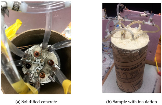 A concrete mixture of water per cement ratio (W/C) equals 0.5 was used to fill the two molds. After a solidification period of one week, both models were ready for testing. Clear Polyvinyl chloride (PVC) tubes were used to connect the U-tubes legs with the water-bath, valve, and flowmeter as in Figure 5a. Heavy-duty construction cardboard with a diameter and length of 20 and 40 cm, respectively, was used to surround the sample and a foam insulation layer of 5 cm thickness as in Figure 5b.