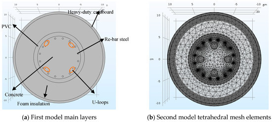 A 3-D numerical model was developed using the COMSOL Multiphysics finite element method for the experimental samples. Four U-tubes HEX was inserted inside the concrete, where the 4 U-tubes HEX had outer and inner diameters of 6.35 mm and 4.35 mm, respectively. Figure 6a presents the main layers which have been placed to mimic the material surrounding the U-tubes. The layers consist of heavy-duty cardboard, concrete material, foam insulation, and a PVC material. Table 4 provides the properties of each layer. Tetrahedral mesh elements were used to describe the numerical domain, as shown in Figure 6b.