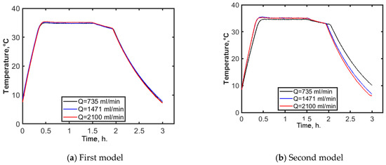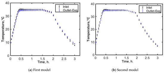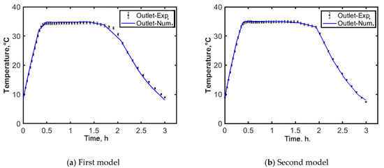 To validate the numerical predictions, the outlet water temperature profiles obtained by the numerical model and the experimental observation are plotted versus the time, as shown in Figure 11. The figure showed that the numerical predictions and the experimental results were in-line for both models.
