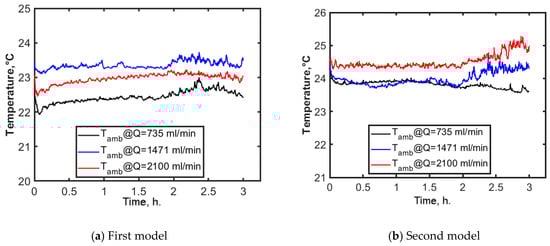 The final temperature distribution inside the concrete best at the end of the precooling process was 8.7 °C. The temperature profile of inlet water for the first model was nearly the same as shown in Figure 7a, but there were small variations of the second model inlet temperature profile as in Figure 7b. The profile of ambient temperature for first model experiments was as in Figure 8a, with an average temperature of 22.5 ± 0.5 °C. That of the second model is shown in Figure 8b, which shows an average temperature of 24 ± 1 °C. The exact temperature profiles of all the previous conditions have been used in the numerical model of each case.