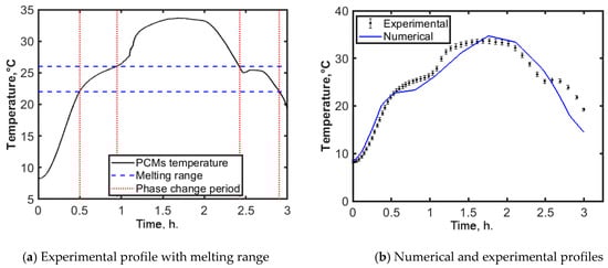 Figure 12 shows the temperature profile inside the PCM containers at a depth of 15 mm. Figure 12a shows the experimental PCM temperature profile with its melting temperature range (22–26 °C). PCM temperature started to increase gradually after the beginning of the charging process until it reached its melting temperature range starting point 22 °C. Beyond this temperature, the PCM containers started their melting process at 0.5 h., at which they absorbed the latent heat of fusion. The melting process was completed nearly after 1 h. Then, the temperature started to increase again, which assured that the whole amount of PCM was melted completely. After the discharging process was initiated, the PCM temperature started to decrease gradually, then it started its solidification process at nearly 2.4 h., which lasted for nearly 0.5 h. During the solidification process, the PCM containers released their latent heat, which was then transferred to the working fluid. Figure 12b shows the numerical predictions along with the experimental results. The graph shows that the numerical temperature profile was in good agreement with the same experimental trend. However, the numerical predictions does not show a constant temperature period during the solidification.