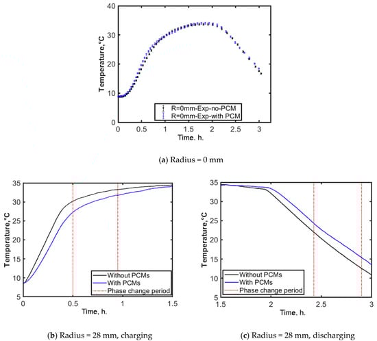 Figure 13 shows the temperature distribution inside both models at different locations during charging process and discharging process. Figure 13a shows the temperature distribution at the center of both samples (radius = 0 mm) and in the middle of the sample’s depth (l = 15 mm). The graph shows that the difference between both samples is small, and the temperature slope of the PCM plot has a smaller increase in temperature than that of the base sample plot during the first hour of the experiment. However, this difference has vanished after the effect of PCM melting reached the center of the sample. Although the discharging process was initiated after 1.5 h, the temperature of the model’s center continued to increase beyond this point due to the transient conduction effect.
