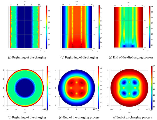 Figure 14 describes the thermal map for a chosen sections inside the second model where the vertical plane was at 0 mm radius, and the horizontal plane was at a depth of 15 cm. The figure shows the numerical temperature distribution inside the model at the beginning and the end of each process. Figure 14a,d show that the concrete pile and the PCM containers were at a uniform temperature of 8.7 °C at the beginning of the charging process while the PVC tube, foam insulation, and the heavy-duty cardboard were at a higher temperature. After the charging process was initiated the heat energy was transferred from the HEX fluid to the concrete and then to the PCM tubes, which increased the PCM temperature and initiated its melting process, as shown in Figure 14b,e. These figures assure the complete melting of the PCM containers as it indicates that the container’s temperature is more than 30 °C.