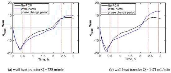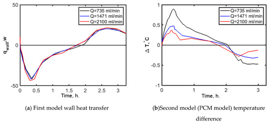 Figure 17 shows the effect of PCM on the HEX tubes wall heat transfer rate at different flow rates during both charging process and discharging process. Figure 17a shows that effect at a flow rate of 735 mL/min, and Figure 17 b at a flow rate of 1471 mL/min. The graphs showed that the heat transfer rate of the second model appears to follow that of the first model with a small increase until the PCM containers melting process was activated at 0.5 h., then the heat transfer rate started to become more than that of the first model. The same trend could be seen during the discharging process, at which the solidification process was initiated nearly at 2.4 h. from the start of the experiment.