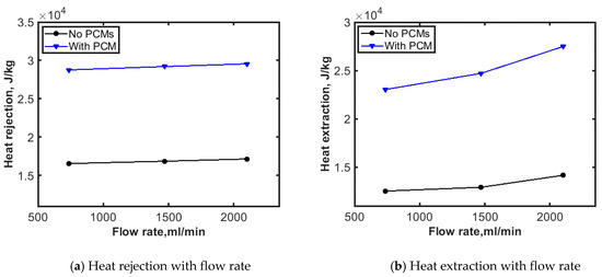 - The presence of PCM increased the amount of heat stored and extracted for the same flow rate, as well as storage efficiency. For the flow rate of 735 mL/min the storage efficiency increased from 75% to 80%; for 1471 mL/min the storage efficiency increased from 76% to 84%; and for 2100 mL/min it increased from 82% to 98%.