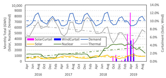 Figure 3 shows monthly average values of the stagnant demand, decreasing thermal supply, increasing nuclear and solar supply, and rapidly increasing curtailment starting from October 2018 in addition to the overall trends. The curtailment occurs in the off-peak seasons, autumn and spring, of demand when nuclear had reached a critical level. The increasing nuclear energy has a clear correlation to curtailment because as it increased, thermal energy decreases. Therefore, there is less flexibility in the energy supply allowing for potentially higher curtailment on days with excess VRE.