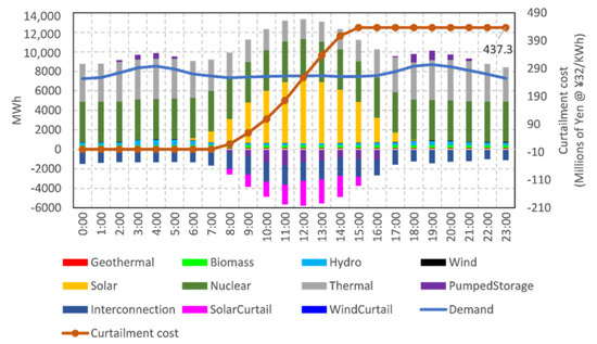 The main cause of curtailment on this day was solar power, which increased dramatically in the morning, reaching a peak ramp-up rate between 08:00–09:00. Then, it continued to increase at a lower ramp rate up to 12:00, when it started to ramp down. As solar ramped up, the other supply types had to be adjusted to maintain the supply/demand balance, which was what happened initially. However, some types, such as geothermal, biomass, hydro, wind, and nuclear, were not adjusted as the solar ramped up, and they remained mostly constant. These supplies are classified as “non-controllable”, as mentioned earlier, because Kyuden has little to no influence over these supplies. This includes solar, as they cannot control its ramp rate. Demand is also classified as “non-controllable”.