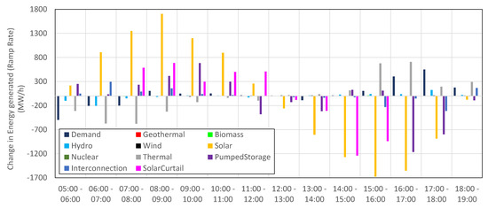 As the solar ramp-up rate decreased, curtailment continued as peak solar generation occurred at 12:00, and the ramp rate of pumped storage went negative, indicating that the charging rate was reduced, perhaps due to the maximum capacity being reached. Then, the solar ramp rate went negative, indicating that solar was ramping down. In the late afternoon, the ramp-down rate of solar curtailment was reduced to zero; therefore, curtailment stopped at 16:00, at which point thermal started to ramp up, and the balance was maintained as the solar ramp rate was also reduced. Pumped storage had a high ramp down rate between 16:00 and 18:00, as its charging rate decreased to almost zero.
