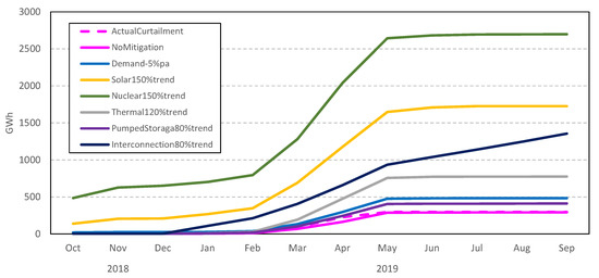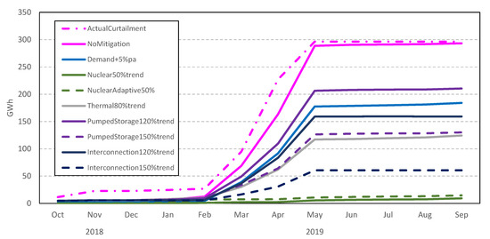 Figure 4 shows the hourly variation in the supply and curtailment of the day with the highest curtailment, 7 April 2019, and is key to understanding the behaviour of all supplies when curtailment occurs. Before 5 am, there was no curtailment, and the demand was mostly met with nuclear and thermal energy. There was a constant value of grid interconnection energy being sent to the neighbouring Chugoku region, as well as a small amount of positive pumped storage energy, which indicates that the pumped storage was releasing energy at that time.