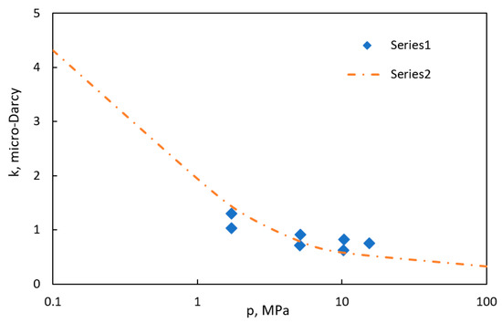 Firstly, the pore network of Barnett shale is generated using the truncated lognormal distribution of Equation (1), and the single-phase flow simulation is validated. Moghaddam and Jamiolahmady [46] presented the experimental study of the apparent gas permeability of Barnett shale samples; the corresponding pore-throat distributions were obtained from high-pressure mercury injection capillary pressure (HPMICP) experiments. We use Equation (1) to fit the experimental throat radius distribution data of HPMICP, and the mean, minimum and maximum of the throat radii are 6.2, 1 and 50 nanometers, respectively. Since the pore throat aspect ratio is non-trivial to be obtained for shale, the value is set as 1.7 following the works of Valvatne and Blunt [22]. For gas flow in shale and tight formations, the smaller the pore size, the more important the effect of a gas–solid collision; therefore, the corresponding non-Darcy effect needs to be considered. After considering the gas non-Darcy flow (the details are provided in our previous work [47]) for every pore element, the calculated apparent gas permeability and experimentally measured data show a good match, as shown in Figure 3, which demonstrates that the generated network is representative for Barnett Shale, which forms the foundation for the following two-phase flow simulation.